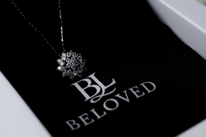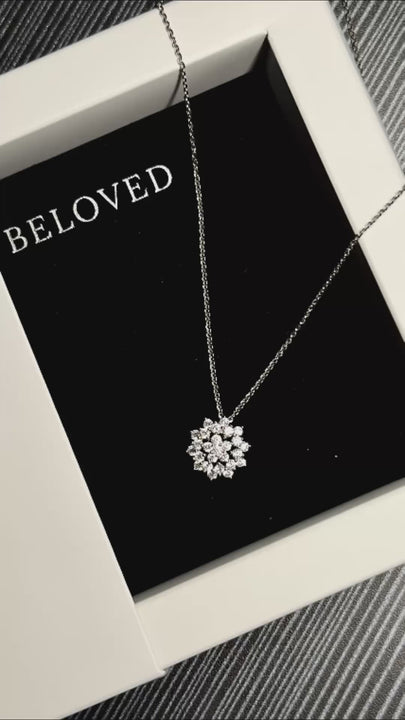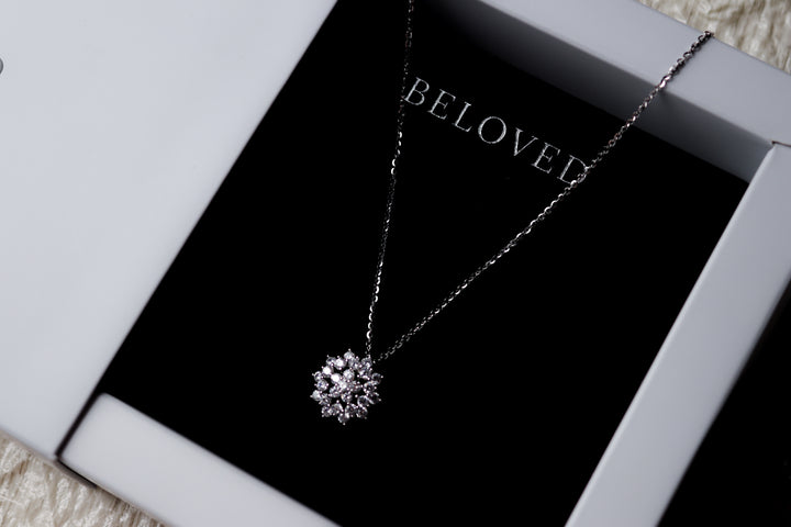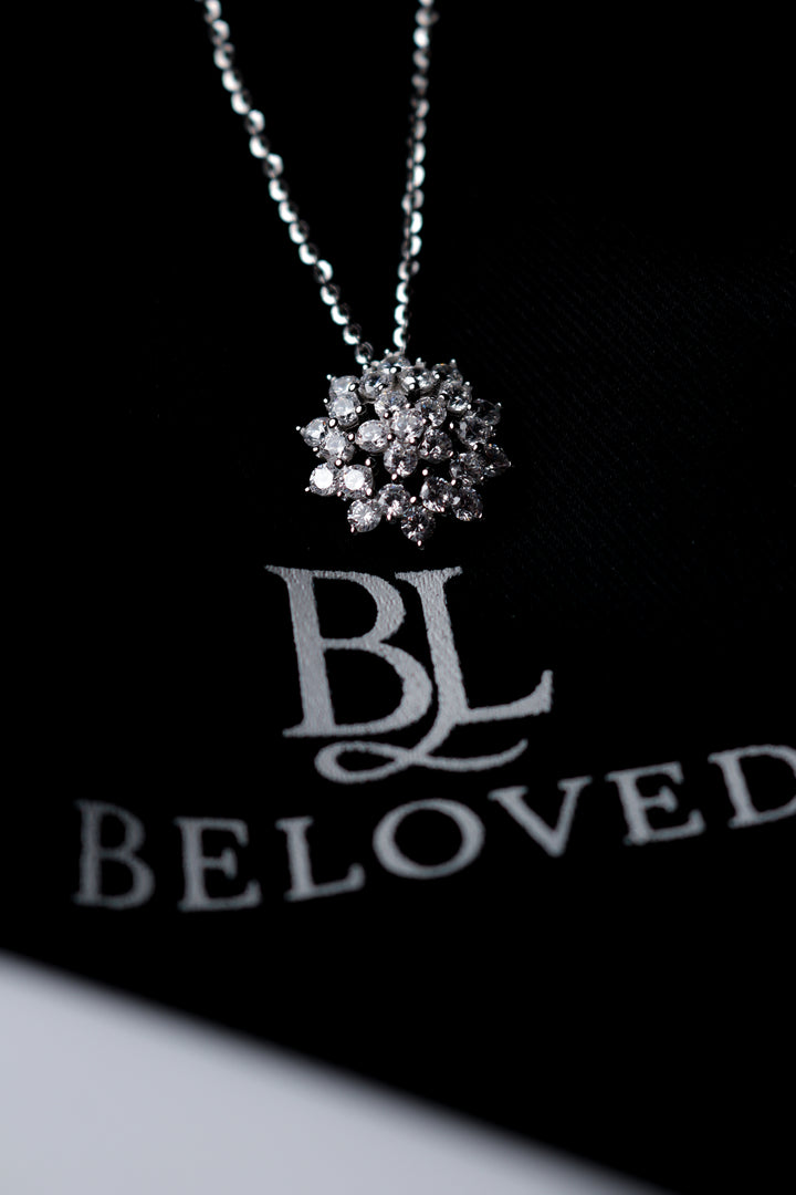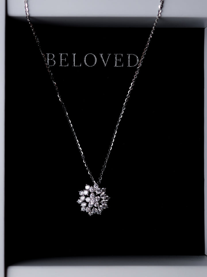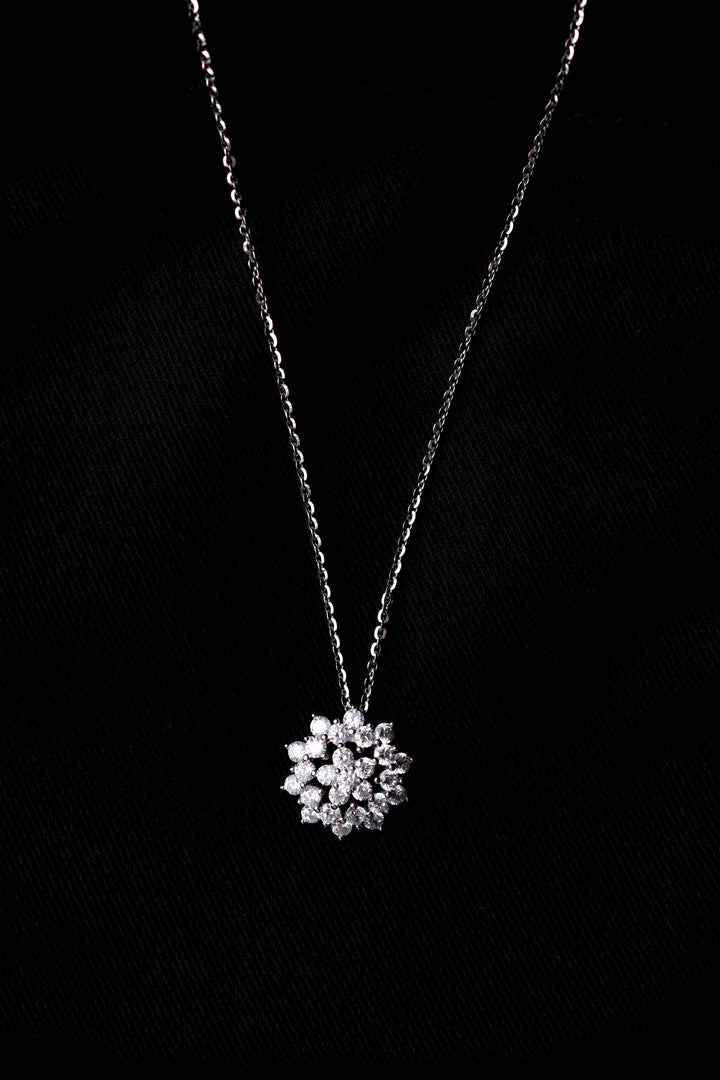 Eight petal flower pendant extra shiny 2 mm zircon studded pendant and 0.30 mm gauge Rhodium plated chain 40 cm in length